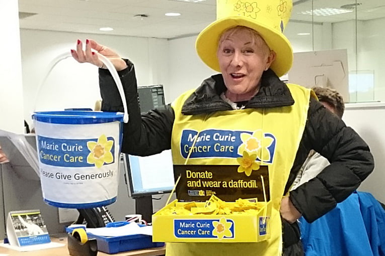 Three Leeds Building Society colleagues have volunteered to join Marie Curie to help the charity collect and raise funds via the daffodil campaign. One of the volunteers, pictured, was Christine Matthews from the Society’s customer liaison team.